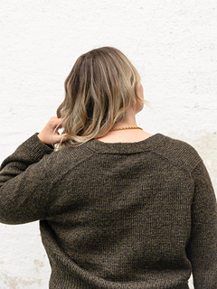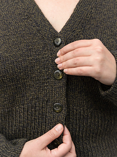 The cardigan is worked seamlessly from the top down. It begins at the back neck, which is increased to the full width of the upper back before stitches are picked up for the shoulders and worked as the fronts. The yoke is knitted flat with increases for both sleeves and body, creating a comfortable fit through the shoulders. The body is left open at the front, framed by the double-knit button bands for a clean, finished edge. At the underarms, sleeves and body are separated and completed individually, the body flat and the sleeves in the round.