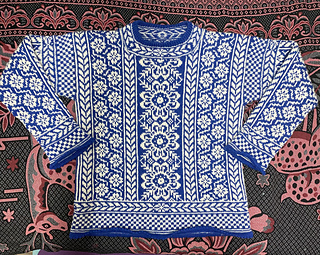 Ladies’ stranded, Norwegian-style pullover with steeked armholes, secured with machine-sewn reinforcement. This pattern has instructions for 2 adult sizes, 44” finished chest for average sizes and 51” finished chest for extra large sizes.
