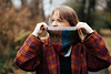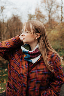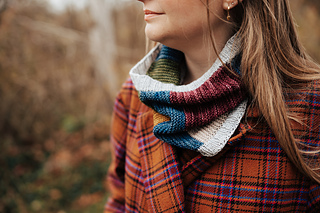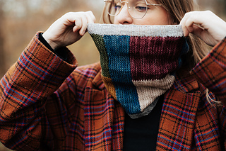 Circular cowl, worked flat with garter stitch and some modular knitting to create a long strip that is joined to create a tube. Ends are picked up and 2x2 ribbing is added to finish top and bottom of cowl.