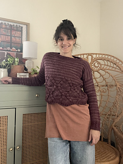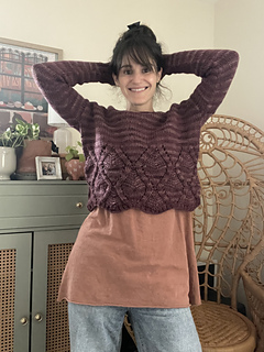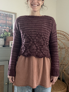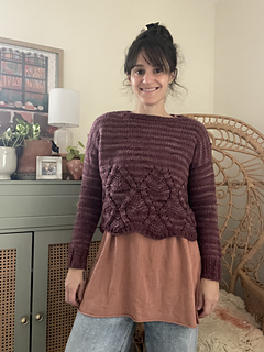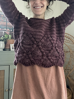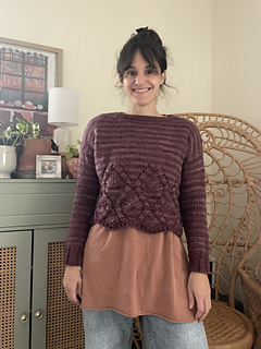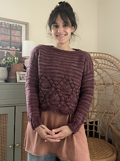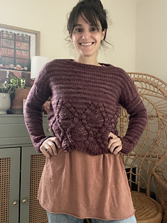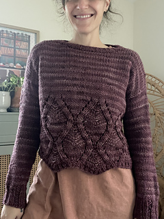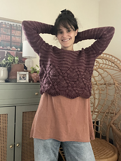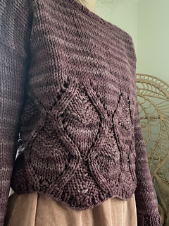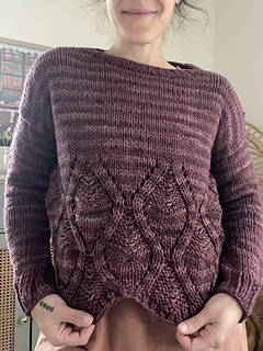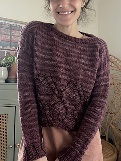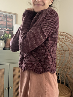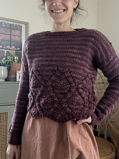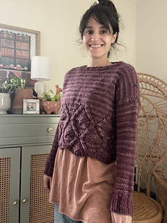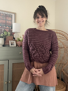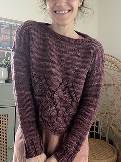 Witchy Vibes is knit from the bottom up in the round. The front and back yokes are knit separately, flat, and feature neckline and shoulder shaping. The yoke halves are seamed at the shoulders. Sleeves are picked up and worked in the round outward from the body.