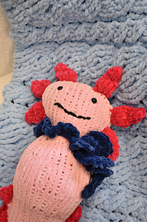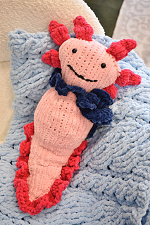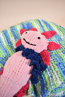 This Axolotl is knit in the round from the bottom up, utilizing increases and decreases for shaping. The Crown and Tail Ruffle are knit separately and attached after completing the Body. The Scarf is knit flat and tied on.