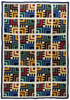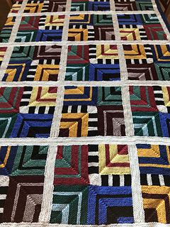 The blanket is worked in “Harry Potter” colors from the Cascade 220 Superwash line. The construction is to work the blocks then join them into horizontal strips using pick up and knit and a 3-needle bind off. The same joining trick is used to join the strips together.