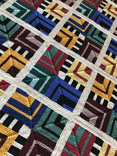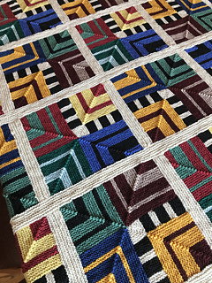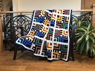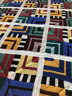 The blocks themselves are composed of striped mitered shapes. The pathway is created with striping and the corner is turned using short rows.
