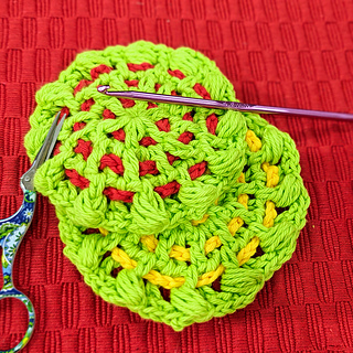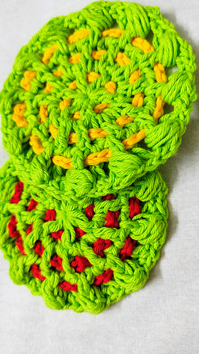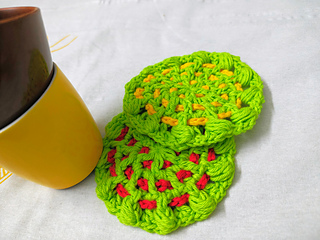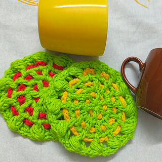 A fun and easy coaster pattern where you work the circular base in mesh stitches and add a contrast chain to it.