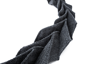 Shaping of this scarf is inspired by the feathers of Hamaya - a “demon-breaking arrow”, a decorative arrow sold at shrines during the New Year’s to ward off misfortune and to attract good luck. The geometric look of the scarf is actually based on V-style pleats that occur in paper folding art of origami. The scarf can transform from a neat compact shape into multidimensional textured accessory.