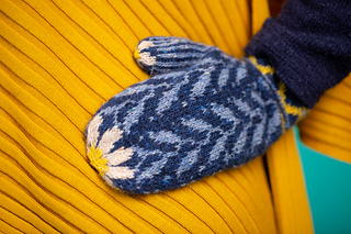 These mittens begin with a provisional cast on and a turned hem, with the exterior of the cuff worked following a colourwork chart. The cuff is then folded and joined together and the body of the mitten is worked following a colourwork chart, inserting a gusset for the thumb. Thumb stitches are put on hold while the body of the mitten is completed, and the floral top of the mitten is shaped and finished. The thumb is picked up and completed with a floral top.