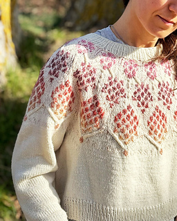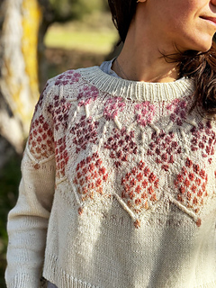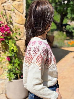 The sweater has a seamless yoke construction and is worked from top to bottom. Once the yoke is knitted, the body and then the sleeves are worked separately. At this point you can knit a few short rows to give more height to the back.