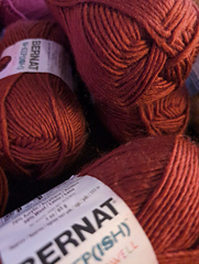 From the Yarnspirations website: Bernat Sheep(ish) by Vickie Howell is a worsted weight wool blend offering the warmth of wool and the easy care of acrylic. It’s available in a range of bright, modern shades chosen by designer and international spokesperson Vickie Howell.