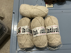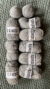 100% alpaca fleece. May also have been sold in 40 gram skeins and on larger cones. 38 yds. per 10 grams.