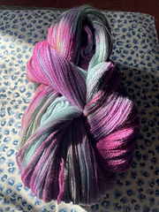 The spongy, ultra-soft Merino wool provides a light touch of warmth, and the deeply heathered colors result in delicate lace that seems like passing shadows. Heathered colors ensure wardrobe versatility since they compliment so many different shades. You’ll find that a shawl, wrap or scarf knit in Shadow can be your go-anywhere chill chaser as well as fashionable accent. If you prefer more substantial lace, this yarn looks lovely knit double stranded.