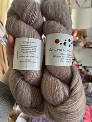 A gorgeously soft and fluffy yarn! Cloud Fingering is ideal for those of us who cannot wear mohair, but tolerate alpaca well (and those who love alpaca, of course). It has a fuzzy halo with a cotton core that does not pick up dye. Although it has fingering yardage, it may be worked on much larger needles for an open airy fabric.