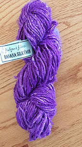 Banana stalks and leaves have long been used for fabrics. Modern methods for processing banana fibers yield what is technically a rayon fiber. Frabjous Fiber’s yarn comes from remnants from the clothing industry and is handspun by women in Nepal and India. The yarn is available kettle dyed or handpainted. Fair trade.